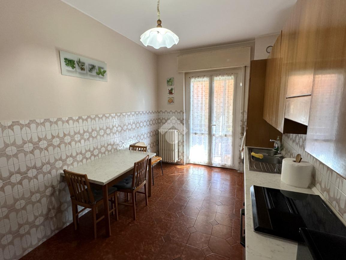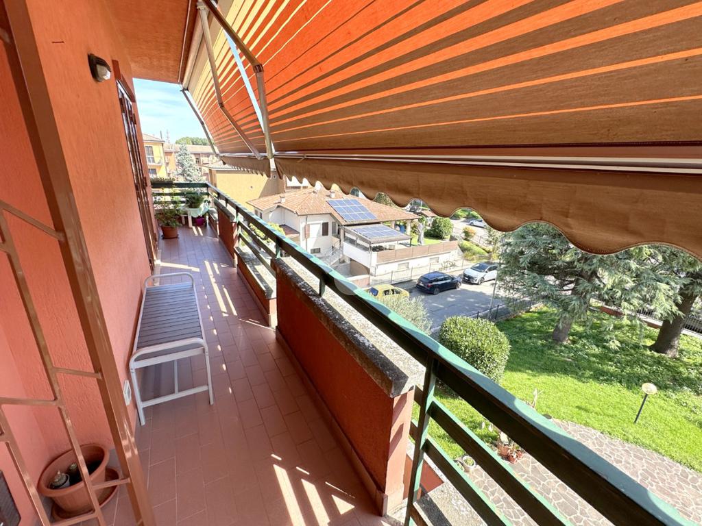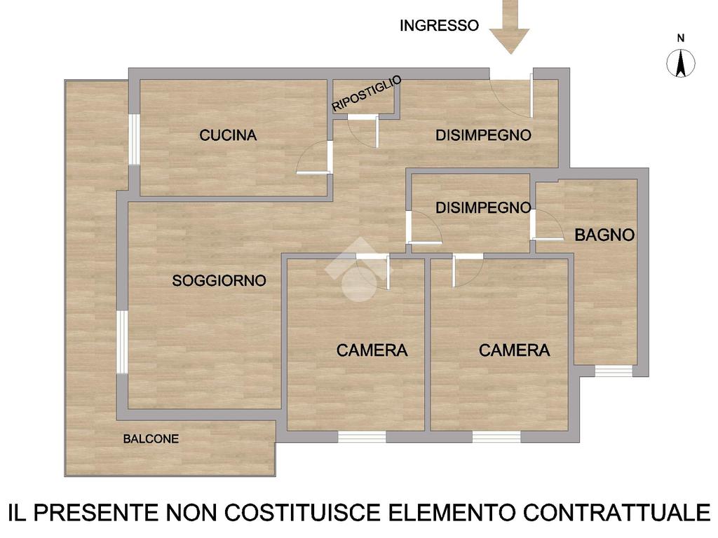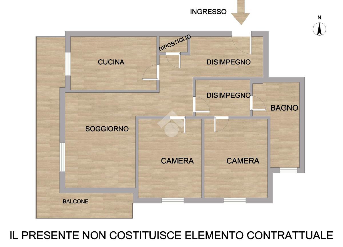 Ingresso, soggiorno con balcone, cucina abitabile, due camere matrimoniali, disimpegno servizio finestrato con box doccia e vasca.