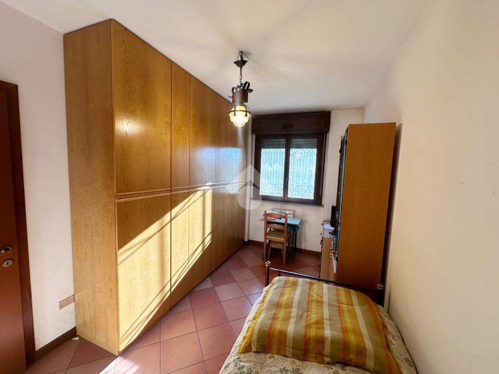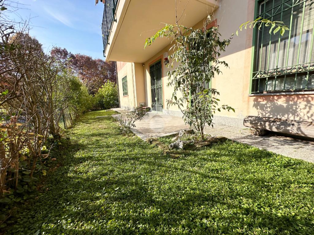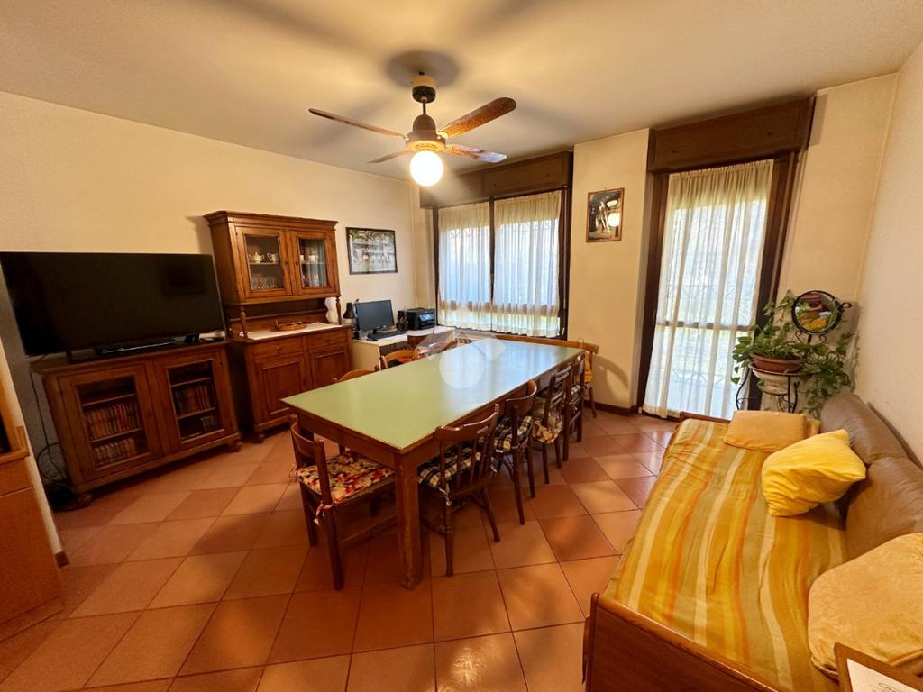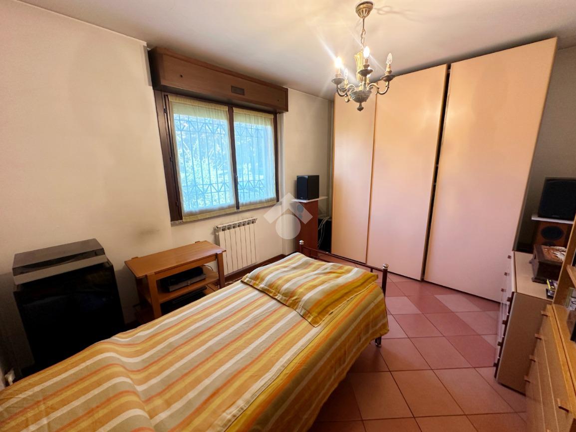 Ingresso, soggiorno (accesso al giardino), cucina abitabile (accesso al giardino),ripostiglio, disimpegno zona notte, camera matrimoniale, servizio finestrato dotato di vasca, camera singola e servizio cieco (dotato di ventola di aspirazione e doccia).